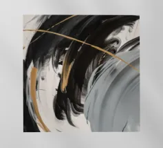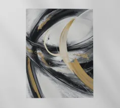 Ein dynamisches abstraktes Kunstwerk, das von schwungvollen Strichen in Grau- und Weißtönen dominiert wird und eine kraftvolle, wirbelartige Bewegung erzeugt. Die monochrome Farbpalette unterstreicht die Textur und den energetischen Fluss der Komposition.