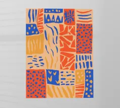 Eine moderne und verspielte abstrakte Komposition mit einer gitterartigen Anordnung von bunten, organischen Formen. Das Kunstwerk wirkt wie ein raffiniertes und ausgewogenes Puzzle aus Form und Farbe.