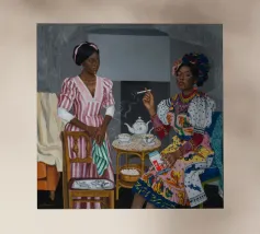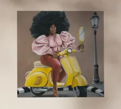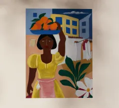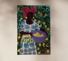 Dieses Kunstwerk zeigt eine Person, die auf einem gestreiften Stuhl sitzt, umgeben von Sonnenblumen und einer grünen Tasche. Der Hintergrund ist ein gedämpftes Braun, das eine rustikale und nachdenkliche Atmosphäre schafft.