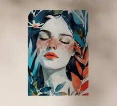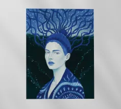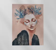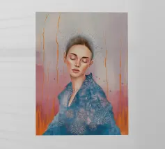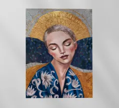 Ein zartes Porträt einer Frau mit wallendem blondem oder hellbraunem Haar, die Augen geschlossen oder nach unten blickend, in einem fein gearbeiteten blau-silbernen oder weißen Gewand, das an Spitze oder Rüstung erinnert.
