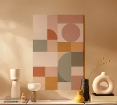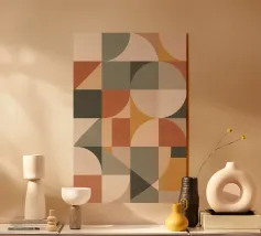 Diese abstrakte Komposition erforscht die Harmonie durch sich überschneidende geometrische Formen und eine warme, vom Vintage-Stil inspirierte Farbpalette. Abgerundete Rechtecke überschneiden sich sanft und schaffen geschichtete Transparenzen, die Bewegung und Tiefe ohne starre Struktur suggerieren. Terrakotta-, Korallen-, Ocker-, zarte Creme- und gedämpfte Goldtöne erinnern an das moderne Design der Jahrhundertmitte und sind gleichzeitig frisch und zeitgemäß. Die subtile Oberflächenstruktur verleiht den Bildern eine taktile Qualität und schafft ein Gleichgewicht zwischen Präzision und Wärme. Das Kunstwerk spiegelt einen ruhigen Rhythmus und ein Gleichgewicht wider, was es zu einem raffinierten Statement für moderne, minimalistische oder retro-inspirierte Interieurs macht.