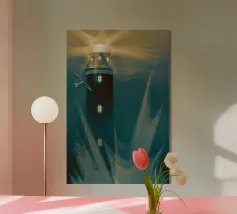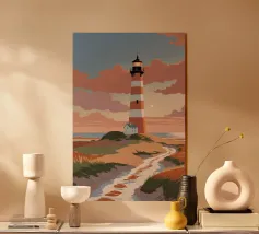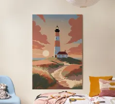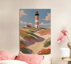 Eine meisterhafte Abstraktion des Hörnumer Leuchtturms mit geschichteten geometrischen Formen, die Tiefe und Bewegung suggerieren. Der Leuchtturm selbst wird von einem strukturierten Hintergrund aus kantigen Elementen umrahmt, wodurch er in der Komposition noch stärker hervorgehoben wird. Das Gleichgewicht zwischen Schatten und Licht, Rot und Weiß, schafft eine visuell fesselnde Interpretation dieses historischen Bauwerks. Dieses moderne Küstenkunstwerk lässt das Wahrzeichen von Sylt in einem frischen und zeitgenössischen Licht erscheinen.