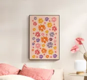 Ein verspieltes Blumenmuster, das wie ein visueller Spaziergang durch ein Retro-Gartenfestival wirkt: Die stilisierten Blüten – in Orange, Pink, Lila, Rot und Gelb – tanzen frei. Jede Blume hat eine einfache, margeritenartige Form mit langen, strahlenförmigen Blütenblättern, die aus einem zentralen Punkt hervorgehen. Die Anordnung ist bewusst unregelmäßig – wie ein Streumuster aus Freude, Sommer und Nostalgie.