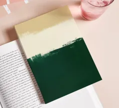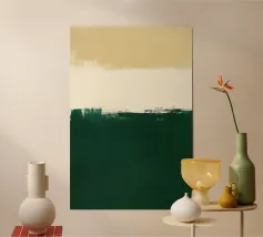 Eine zeitgenössische abstrakte Komposition, die sich um eine rohe, ausdrucksstarke Horizontlinie herum aufbaut. Tiefes Waldgrün verankert die untere Hälfte, während sanfte Beigetöne darüber Leichtigkeit und visuellen Freiraum schaffen. Der strukturierte Übergang zwischen den beiden Bereichen sorgt für subtile Bewegung und malerische Tiefe und verleiht dem Werk einen raffinierten und dennoch organischen Charakter. Minimalistisch in der Struktur, aber reich an Oberflächendetails, erinnert dieses Kunstwerk an Landschaft, Stille und ruhige Selbstbeobachtung.