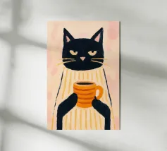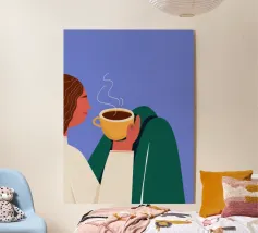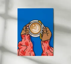 Abstrakte Illustration einer dunklen Hand, die eine schwarze Kaffeetasse hält. Zarter Dampf steigt in hellen Lavendellinien auf. Der Hintergrund ist hellgrün mit feinen Pinselstrukturen. Minimalistische Komposition mit Fokus auf Form, Farbe und Balance.
