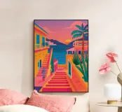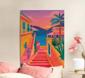 Ein atemberaubender Blick auf eine lebhafte mediterrane Treppe, flankiert von bunten Gebäuden und üppigen Palmen. Die Perspektive lenkt den Blick nach oben in Richtung eines strahlenden Himmels und vermittelt ein Gefühl von Optimismus, Abenteuer und dem Traum von einem perfekten Sommerurlaub.