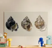 A refined watercolor study of three spiral seashells, showcasing striking natural patterns in earthy tones from charcoal black to ochre and ivory. Set against a soft taupe background, this artwork blends scientific precision with beachside elegance — perfect for coastal interiors, nature collections, or shell-themed decor.