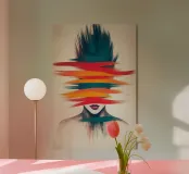 Ein Gesicht, teilweise verborgen hinter wilden, horizontalen Farbstrichen in Rot, Orange und Gelb, scheint zwischen Realität und Abstraktion zu schweben. Die expressive Pinselführung verdeckt die Augen und erzeugt ein Gefühl von Identitätsverlust oder verzerrter Wahrnehmung. Die dunklen Haare und der neutrale Hintergrund verstärken die Intensität der Farben, wodurch ein starkes visuelles Spannungsfeld entsteht. Eine surreale Darstellung von Emotion, Verwirrung und Selbstfindung.