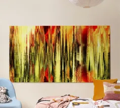Eine abstrakte Neuinterpretation eines Sonnenaufgangshimmels, der in kreisförmige Zickzack-Muster in warmen Rot-, Orange- und Grautönen verwandelt wurde. Die dynamischen Farbtöne vermitteln ein Gefühl von Bewegung und Energie und eignen sich perfekt als kühner Wandkunstdruck für Wohnzimmer, Büros oder kreative Räume.