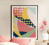 Eine dynamische und farbenfrohe abstrakte Collage mit sich überschneidenden Formen und verschiedenen Mustern, darunter Polka-Dots, Streifen und Volltonfarben, die ein fröhliches, energiegeladenes Gefühl vermitteln.
