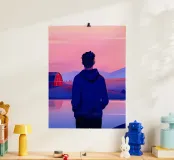 Eine Person, die in der Nähe eines Teiches in Abend-Sonnenuntergang Lofi Kunst Poster