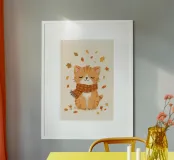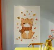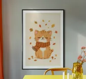 Orangefarbene Katze, die einen Schal mit Herbstblättern trägt Poster