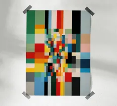 Eine geometrische Komposition mit einem Raster aus bunten Rechtecken und Quadraten, durchsetzt mit Grautönen, schafft ein modernes und abstraktes Muster. Die Anordnung der verschiedenen Farben und Farbverläufe verleiht dem Werk einen rhythmischen visuellen Fluss.
