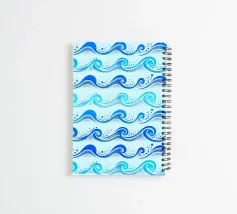 Whimsical aquatic coastal pattern with rolling ocean waves in cobalt blue and aqua blue, on a light blue background.
