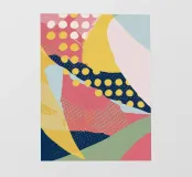 Eine dynamische und farbenfrohe abstrakte Collage mit sich überschneidenden Formen und verschiedenen Mustern, darunter Polka-Dots, Streifen und Volltonfarben, die ein fröhliches, energiegeladenes Gefühl vermitteln.