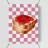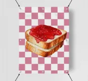 Ein Stapel von drei Toastbrotscheiben mit einer großzügigen Schicht leuchtend roter Marmelade auf der Oberseite befindet sich vor einem rosa und weiß karierten Hintergrund. Die realistische Darstellung des Brotes kontrastiert mit dem verspielten, geometrischen Hintergrund.
