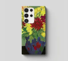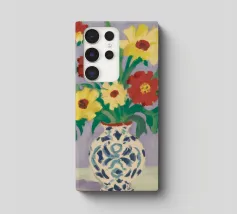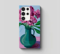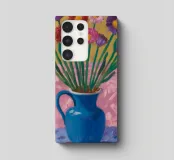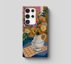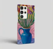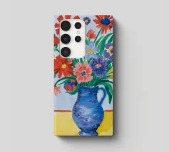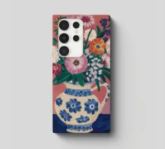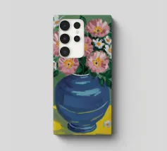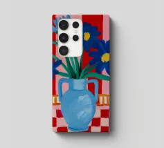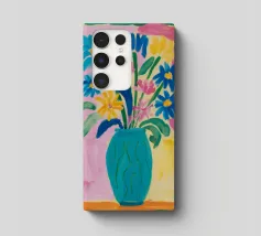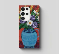 Ein lebhaftes Arrangement bunter Wildblumen in einer kräftigen blauen Vase. Der Hintergrund ist ein strukturiertes, gemustertes Rosa, das eine reiche und fröhliche Komposition voller Leben und Farbe schafft.