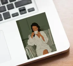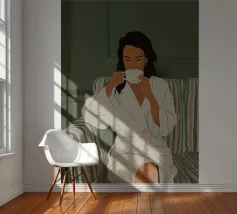 Eine Frau in einem kuscheligen weißen Bademantel genießt eine Tasse Tee und fängt damit einen Moment der ruhigen, friedlichen und kultivierten Selbstfürsorge am Morgen ein.
