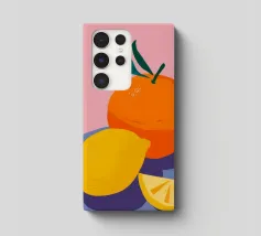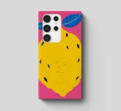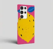 Eine große, einzelne gelbe Zitrone, illustriert mit einem strukturierten, düsteren Stil vor einem leuchtend rosa Hintergrund. Das Werk ist eine kühne, moderne und grafische Pop-Art-Interpretation einer klassischen Frucht.