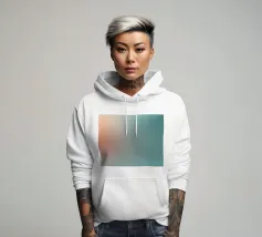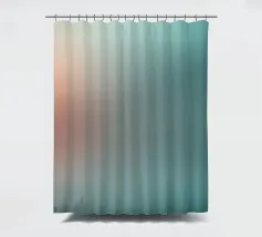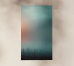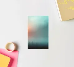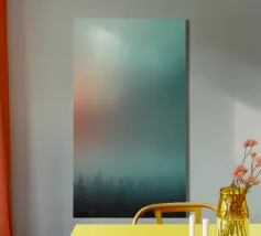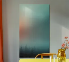 Sanfte Orange- und Teal-Töne gehen nahtlos ineinander über und schaffen eine beruhigende Kulisse. Silhouetten von Bäumen tauchen aus dem Nebel auf und verkörpern eine heitere Atmosphäre am frühen Morgen.
