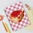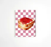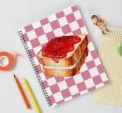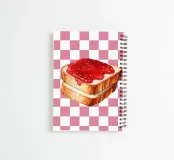 Ein Stapel von drei Toastbrotscheiben mit einer großzügigen Schicht leuchtend roter Marmelade auf der Oberseite befindet sich vor einem rosa und weiß karierten Hintergrund. Die realistische Darstellung des Brotes kontrastiert mit dem verspielten, geometrischen Hintergrund.