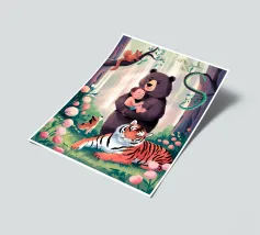 Dieses Kunstwerk zeigt eine mürrisch aussehende Wolke mit einer Gedankenblase, die einen Vogel und einen Bären enthält. Die humorvolle und fantasievolle Szene ist vor einem sanften blauen Hintergrund zu sehen.