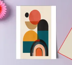 Ein abstraktes Kunstwerk mit geometrischen Formen in erdigen Grün-, Orange- und Beigetönen, die ausgewogen auf einem hellen, strukturierten Hintergrund angeordnet sind.