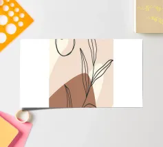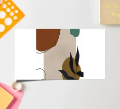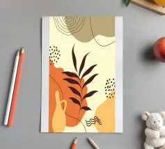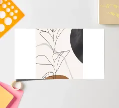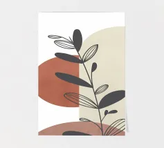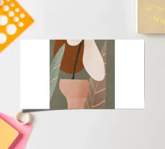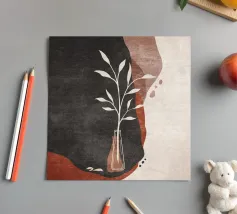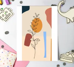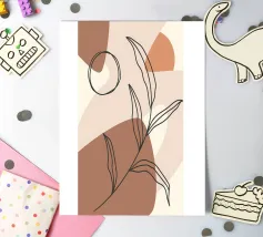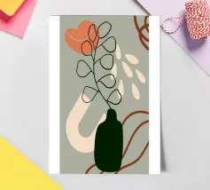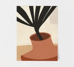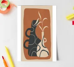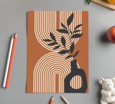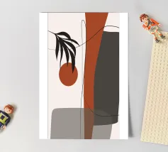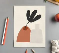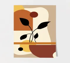 Abstrakte Linien und Blöcke in gedeckten Farben bilden eine moderne Komposition mit einer minimalistischen Ästhetik. Eine stilisierte Pflanzenform und eine einfache Vasenform fügen organische Elemente hinzu, die mit geometrischen Formen kontrastieren.