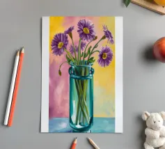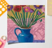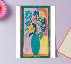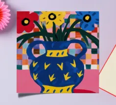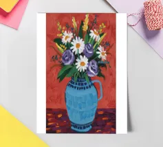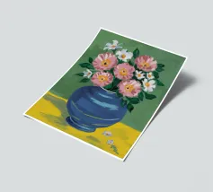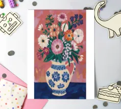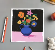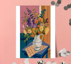 Ein lebhaftes Arrangement bunter Wildblumen in einer kräftigen blauen Vase. Der Hintergrund ist ein strukturiertes, gemustertes Rosa, das eine reiche und fröhliche Komposition voller Leben und Farbe schafft.