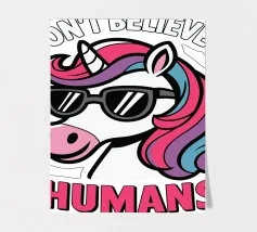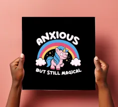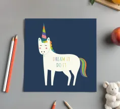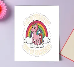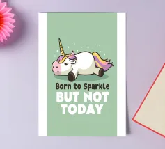 Ein niedliches Einhorn mit Regenbogenmähne sitzt umgeben von Sternen, begleitet von dem humorvollen Text "I cannot brain today, I has the dumb." Das Bild steht vor einem einfarbigen Hintergrund.
