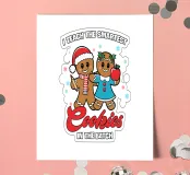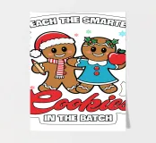 Zwei lächelnde Lebkuchen sind festlich gekleidet, wobei einer eine Weihnachtsmannmütze trägt und der andere einen Apfel in der Hand hält. Um sie herum ist der Satz "I teach the smartest cookies in the batch" (Ich unterrichte die klügsten Kekse in der Gruppe) gedruckt, der ein spielerisches, pädagogisches Thema hinzufügt.