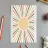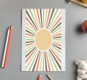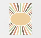 Strahlende Linien in erdigen Tönen wie Grün, Braun und Orange erstrecken sich von einem zentralen Kreis nach außen und erzeugen einen Sunburst-Effekt. Das Design weist eine Retro-Ästhetik mit symmetrischen Mustern und einer beruhigenden Farbpalette auf.