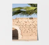 Storch und eine Palme. Botanische Szenerie in Marrakesch. Straßenfotografie in Marokko.