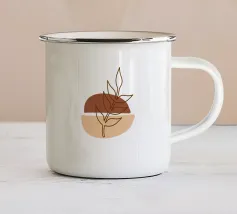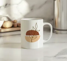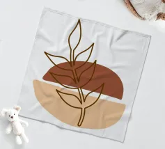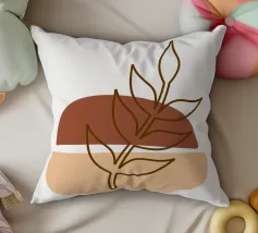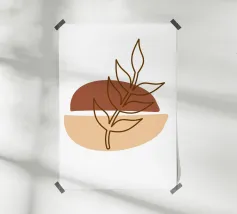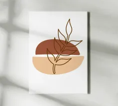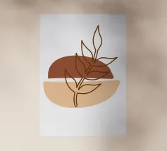 Eine abstrakte Komposition mit einem einfachen geometrischen Hintergrund in Braun und Beige und einer zarten Linienzeichnung eines belaubten Zweigs. Das minimalistische Design betont die natürlichen Elemente in einem harmonischen Gleichgewicht.