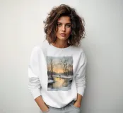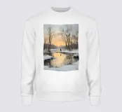Dieses stimmungsvolle Kunstmotiv zeigt eine ruhige Winterlandschaft mit schneebedeckten Bäumen, gefrorenem Fluss und einem warmen Sonnenuntergang, der goldene Reflexionen auf das Eis zaubert. Eine einzelne Figur in der Ferne verstärkt die Ruhe und Besinnlichkeit dieser Szene. Perfekt für alle, die romantische Winterbilder, Landschaftskunst, Naturmotive und stimmungsvolle Wanddekoration lieben. Ideal als Winter Art Print, Weihnachtsbild, Natur Wandbild, Landschaftsposter, gemütliche Wohnraumdeko, Winterlandschaft Kunst, Geschenkidee, romantische Winterkunst und Natur Illustratio.