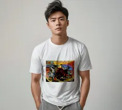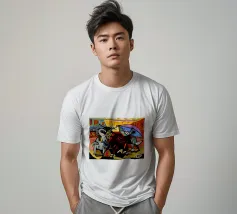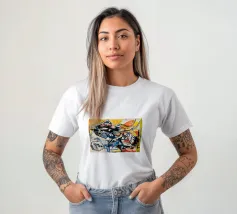 Dieses lebendige und energiegeladene abstrakte Gemälde zeichnet sich durch ein dynamisches Zusammenspiel von fragmentierten Formen und kühnen Linien aus, die eine reiche Palette von Orangen, Gelb, Violett und Blau aufweisen. Die Komposition suggeriert dekonstruierte Elemente, möglicherweise Figuren oder Objekte, in einer wirbelnden, energiegeladenen Bewegung, die charakteristisch für kubistische und abstrakte expressionistische Einflüsse ist. Die komplizierten Details und kontrastreichen Farben schaffen ein fesselndes und zum Nachdenken anregendes visuelles Erlebnis. Dieses hochwertige Digitalposter (7000x5000 Pixel, 300 dpi) fängt die rohe Energie und das künstlerische Genie des Originals wunderbar ein.