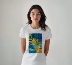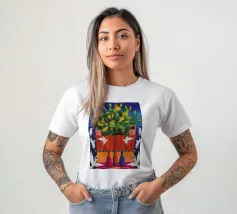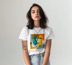 Ein Stillleben mit Zitronen in einer blauen Schale, die auf einem reichhaltigen violetten Tuch ruht. Dahinter steht eine hohe gelbe Vase mit weißen Zweigen vor einem feurig orangefarbenen Hintergrund, der eine kontrastreiche, farbenfrohe Szene erzeugt.