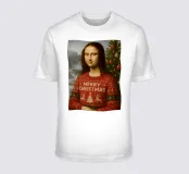 Mona Lisa trägt einen Weihnachtspulli am ersten Weihnachtstag. Mona Lisa trägt einen Weihnachtspulli mit der Aufschrift Frohe Weihnachten und einer Weihnachtsszene auf der Vorderseite. Hinter ihr steht ein Weihnachtsbaum mit Kugeln und Lichterketten. Im Hintergrund sind Schnee und eine Winterlandschaft zu sehen.