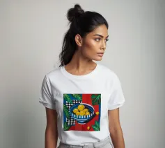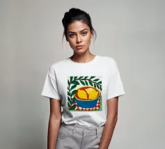 Ein sanftes und heiteres Stillleben einer Schale mit Zitronen auf einer gemusterten Oberfläche, mit fließenden grünen Blättern im Hintergrund, das in einer sanften, pastellartigen Palette wiedergegeben ist.