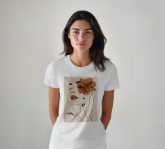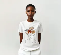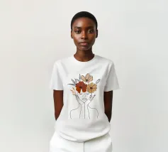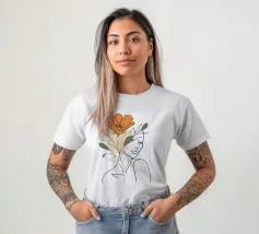 Eine minimalistische Strichzeichnung zeigt das Profil einer Frau mit heiterem Ausdruck. Ihr Haar ist mit großen, stilisierten orangefarbenen und gelben Blumen und zarten Blättern geschmückt.