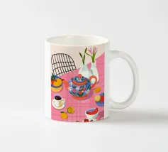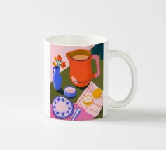 Dieses Kunstwerk zeigt einen gedeckten Tisch mit einem Krug, einer Vase mit Blumen, einem Teller mit einer Zitronenscheibe und einer Tasse. Der Hintergrund besteht aus einer rosafarbenen Wand und einer grünen Tischdecke, die eine fröhliche und einladende Frühstückssituation schaffen.
