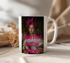 Fügen Sie einen Hauch von Humor hinzu mit "Waiting for Happy Hour", einem entzückenden Pop-Art-Druck, der klassische Eleganz mit einer modernen, witzigen Stimmung verbindet. Dieses fesselnde Kunstwerk zeigt eine heitere historische Figur, die mit einer zarten Kreuzkette geschmückt ist und nachdenklich in die Ferne blickt, als ob sie in Erwartung wäre. Der fettgedruckte, pinkfarbene Text "WAITING FOR HAPPY HOUR" überlagert das Bild und verwandelt das zeitlose Porträt in einen humorvollen Ausdruck moderner Sehnsucht. Perfekt, um jedem zeitgenössischen Raum Persönlichkeit und eine unbeschwerte Note zu verleihen. Hergestellt mit einer außergewöhnlichen Auflösung von 7000x5000 Pixeln