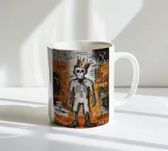 Das Bild zeigt eine Figur im Stil von KAWS, die inmitten einer Graffiti-Kulisse steht. Die Figur hat einen markanten, totenkopfähnlichen Kopf mit "X" als Augen und trägt ein dunkles Hemd mit dem Wort "KAWS" in gelber Farbe. Der Hintergrund ist mit verschiedenen Graffiti-Elementen gefüllt, darunter Dollarzeichen, Kronen und Textfragmente wie "LOVE", "FASHION" und "STREET ART".