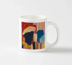Ein Flickenteppich aus verschiedenen Mustern, darunter Linien und U-Formen, in leuchtenden Gelb-, Blau-, Rosa- und Rottönen, erzeugt in diesem abstrakten Stück einen farbenfrohen Mosaikeffekt.