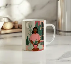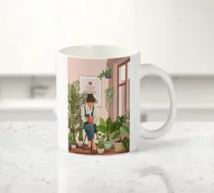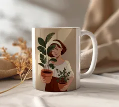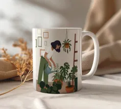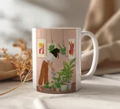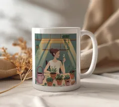 Eine ältere Frau pflegt ihre Pflanzen in einem sanft getönten Raum und drückt damit Weisheit, Ruhe und zeitlose Verbundenheit mit der Natur aus.