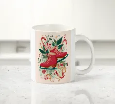 Eine Figur in einem grünen Pullover und einer roten Hose läuft Schlittschuh vor einem rosa Hintergrund mit Schneeflocken. Die Figur scheint die Wintersaison zu genießen.