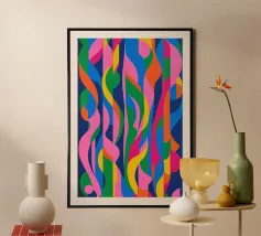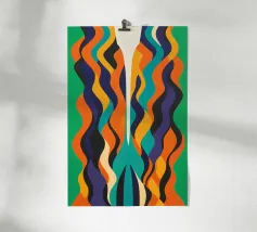 Ein gewagtes abstraktes Muster mit einem Hauch von dynamischer Energie, das Bewegung und Fließen symbolisiert. Kräftige Farben, die Themen wie Wasser, Leben und Bewegung hervorrufen. Eine innovative Verschmelzung von Tradition und Moderne für zeitgemäße, minimalistische Innenräume. eine einzigartige visuelle Sprache, die kulturelle Grenzen überwindet.