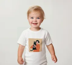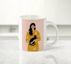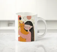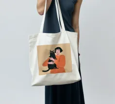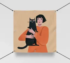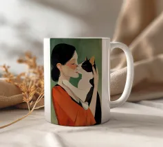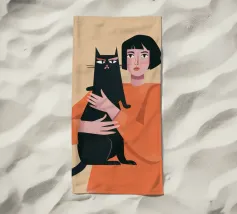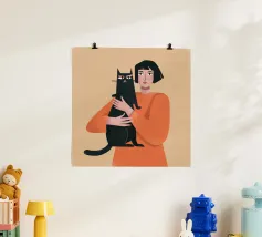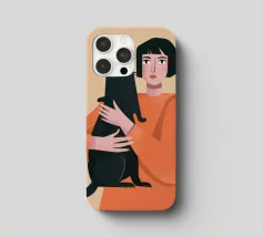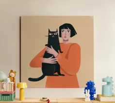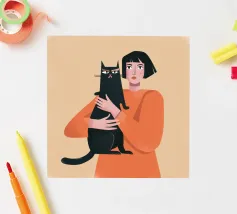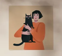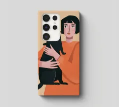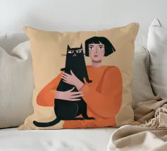 Eine Person in einem leuchtend orangefarbenen Oberteil hält eine geschmeidige schwarze Katze an sich gedrückt. Ihre Blicke sind aufeinander gerichtet und unterstreichen die enge Bindung zwischen Mensch und Haustier vor einem einfachen, warm getönten Hintergrund.