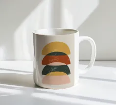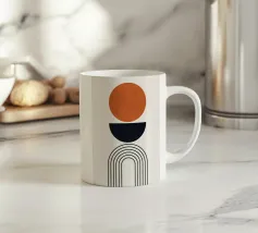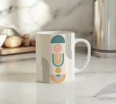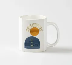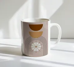 Eine geometrische Komposition mit verschiedenen Formen, darunter ein Halbkreis, der an die Sonne erinnert, konzentrische Kreise und Bögen in gedämpften Pastelltönen. Das Design ist symmetrisch und bietet ein ausgewogenes Verhältnis zwischen optisch ansprechenden Elementen.