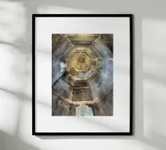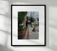 Dieses Kunstwerk zeigt ein markantes Fliesenmuster aus Matosinhos, Portugal, bei dem geometrische Formen und Retro-Farben in perfekter Harmonie zusammenkommen. Das abstrakte Design mit Ocker-, Lavendel-, Oliven- und Cremetönen spiegelt die moderne Ästhetik der Jahrhundertmitte wider und trägt gleichzeitig das kulturelle Erbe der traditionellen portugiesischen Azulejos in sich.